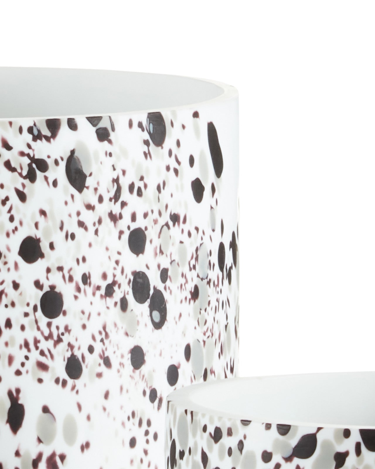 The Pari White Confetti Vases feature two watertight vessels made from opaque white glass, decorated with multi-colored flecks of gray, black, and purple. These vibrant speckles mimic the style of modern painters and make the vases ideal for floral arrangements. Each is sold separately.