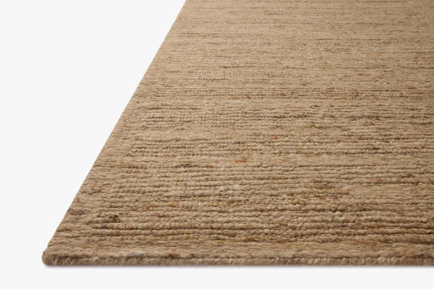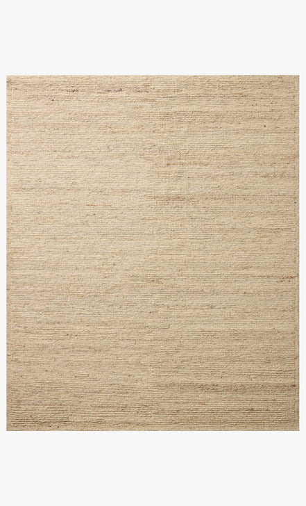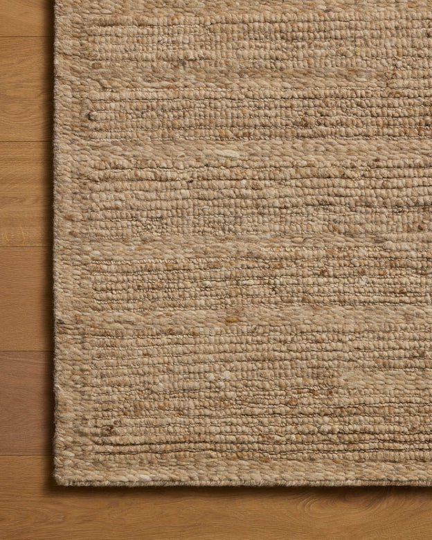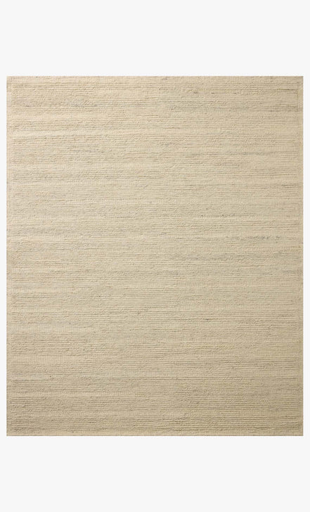 The Lennox Collection by Leanne Ford x Loloi features a hand-woven area rug crafted from natural undyed wool in creamy neutral tones. With a soumak weave of alternating thick and thin yarns, it offers an organic texture. Made in India and GoodWeave-certified, it supports ethical production and weaver communities.