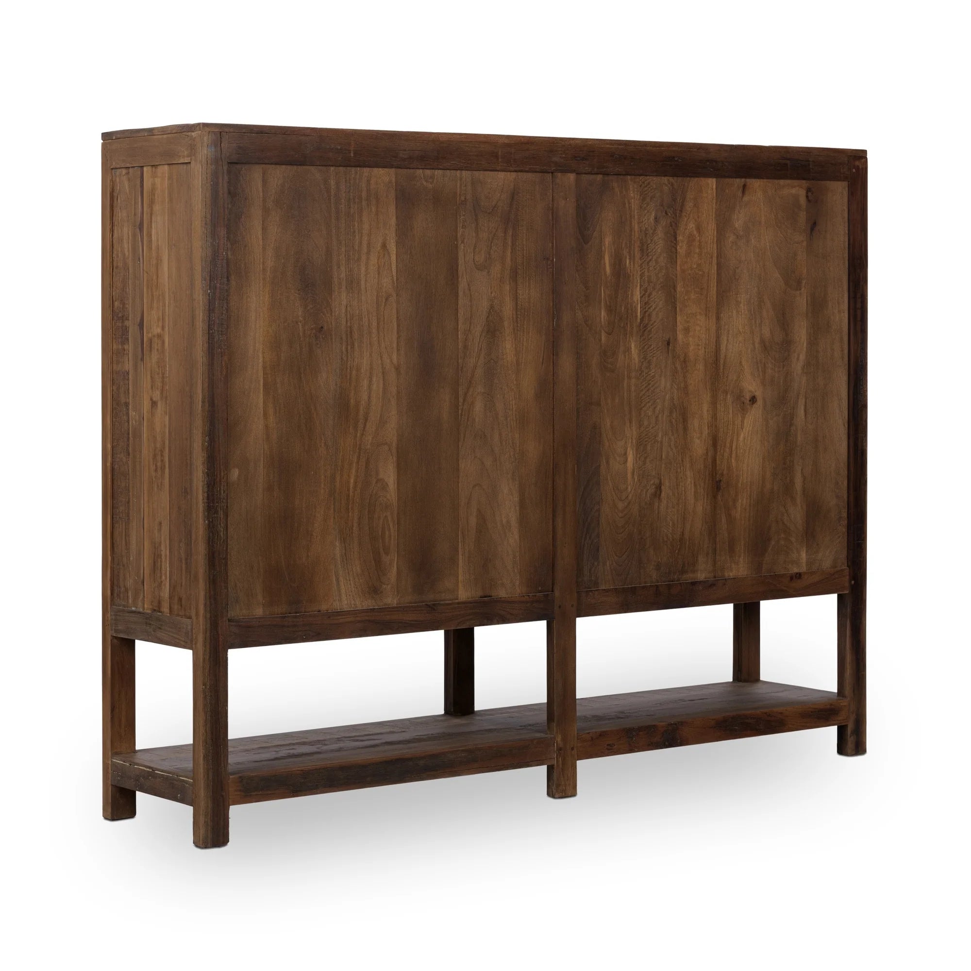 Discover the timeless beauty of our Reclaimed Wood 4 Door Cabinet. Handcrafted from eco-friendly salvaged wood, it features framed glass panel doors and a rustic, natural finish. With adjustable shelves for versatile storage and a lower open shelf for display, this cabinet is perfect for dining rooms, living rooms, or kitchens and complements modern farmhouse, industrial, and vintage décor.