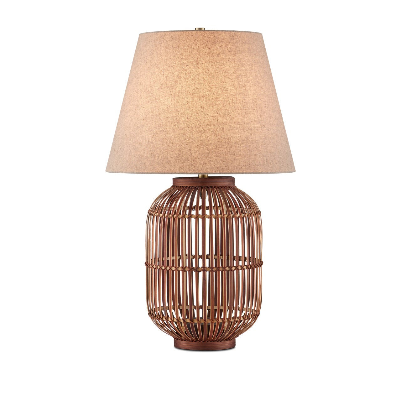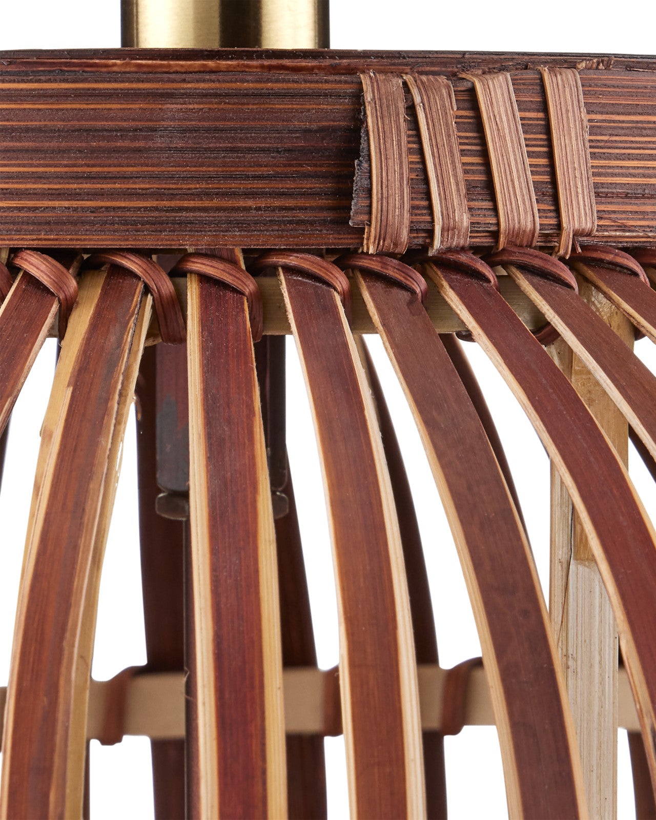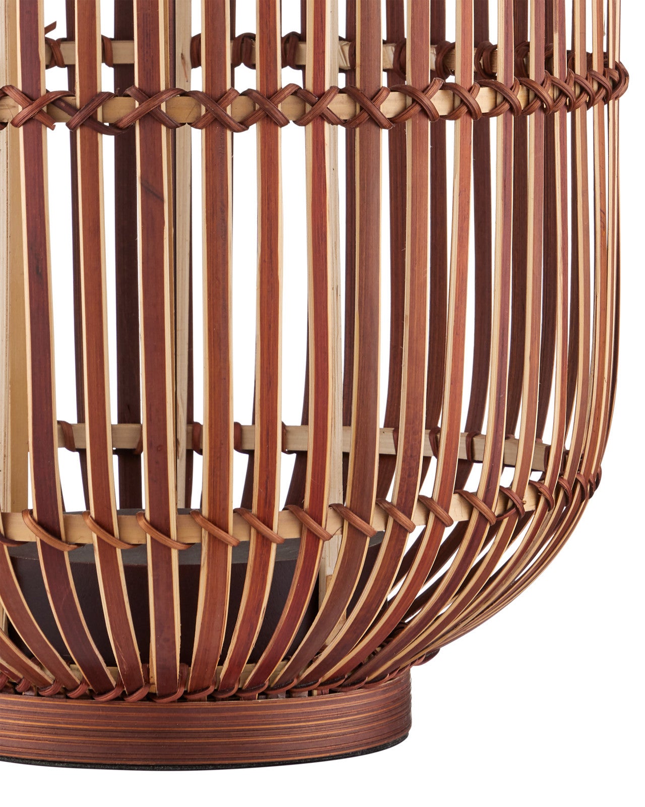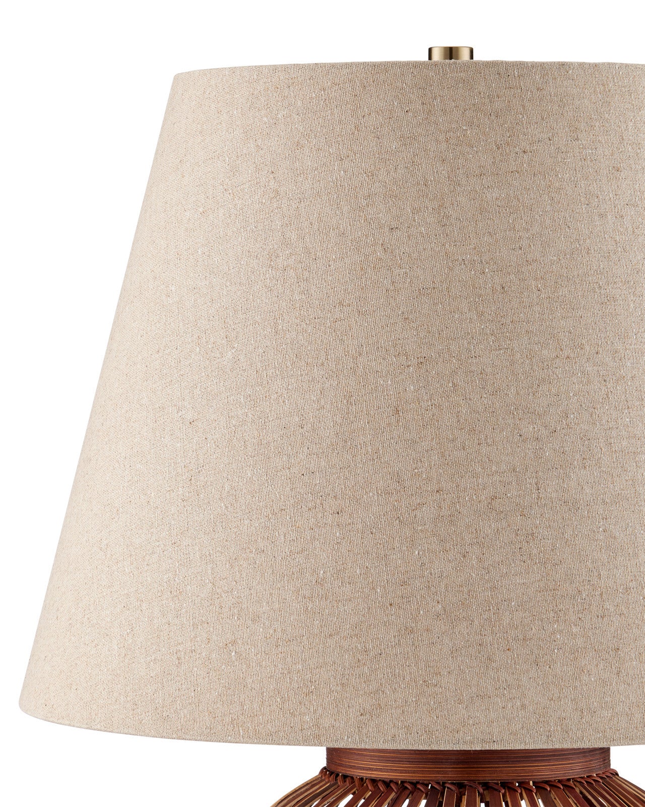 The Cyrus Table Lamp has a shape similar to a Japanese lantern. It is made by splitting and polishing bamboo strands, which are then tied together with thinner strips. The natural material creates interesting light and dark patterns. The open weave, with spaces between the reeds, adds texture to the brown table lamp.