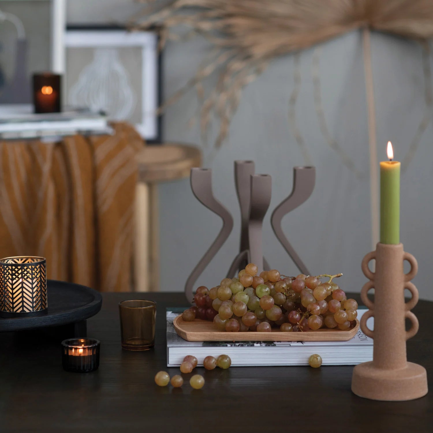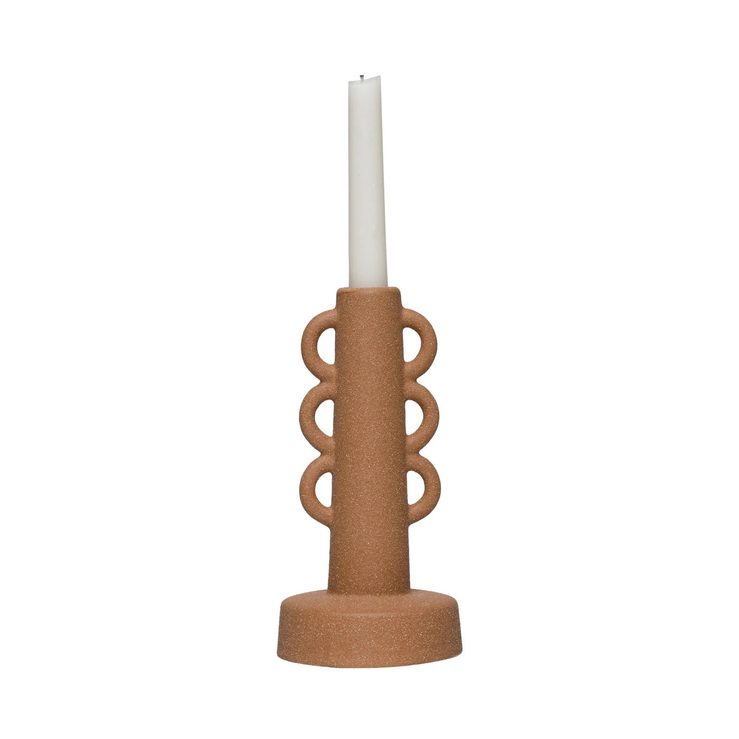 Elevate your décor with this stunning modern stoneware taper candle holder, featuring a striking sculptural design that adds a touch of sophistication to any space. Its uniquely textured sand finish creates a warm, inviting ambiance, making it the perfect centerpiece for your next gathering or a charming accent in your home.