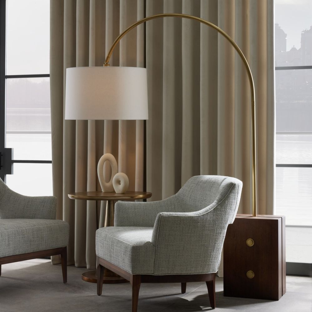 Our Block Arched Floor Lamp features a unique combination of materials. It has a sturdy base made of walnut-finished rubberwood, highlighted by antique brass bolts. The arching brass arm holds a drum-shaped shade of white linen that evenly spreads light. Arrives with a black cloth cord, a full-range dimmer, and a shade that can pivot. Please note that the finish may vary.