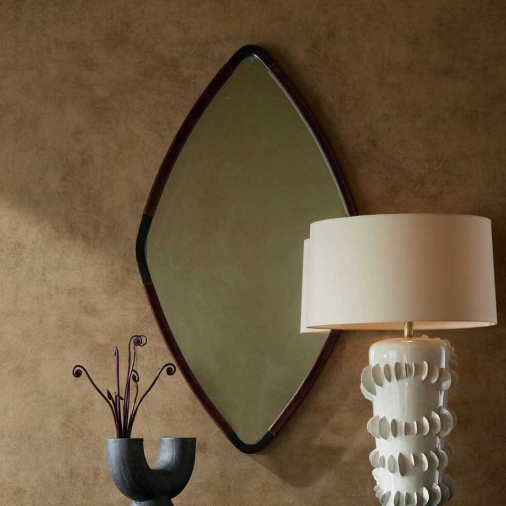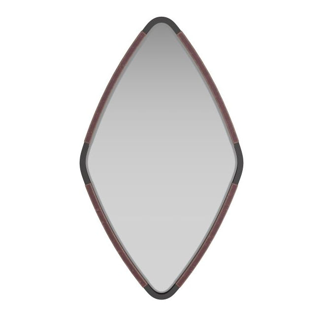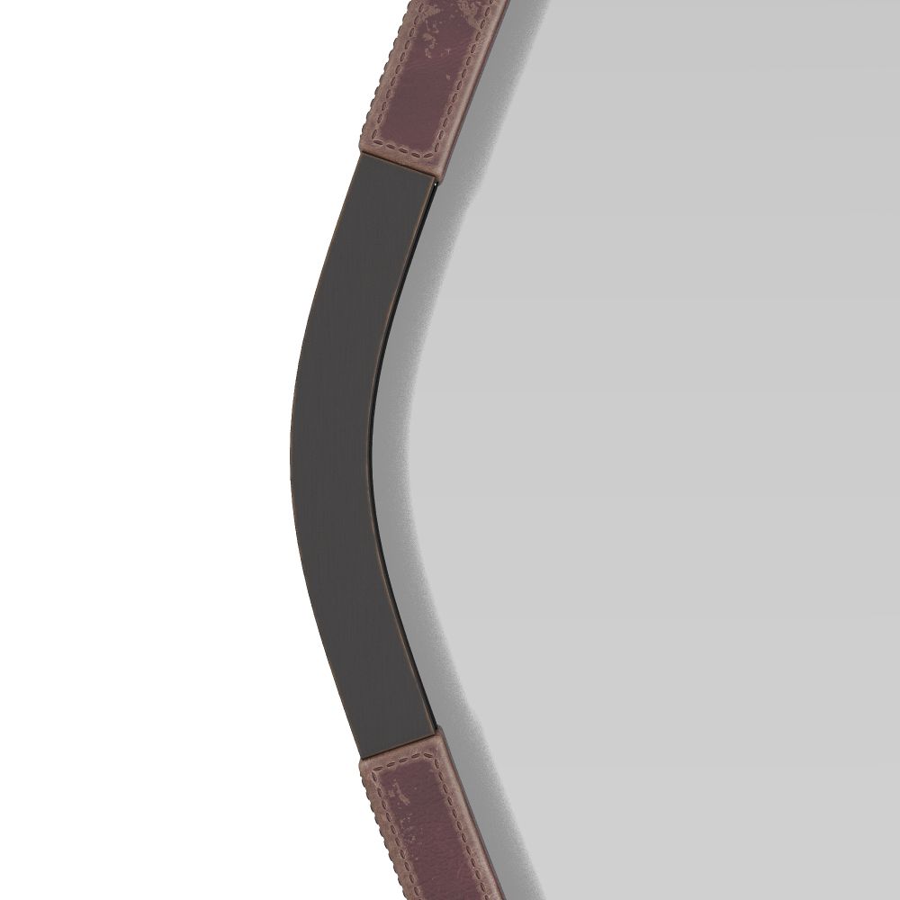 Our jewelry-inspired Brielle Mirror features shades of deep merlot and is topstitched for added visual interest. It is wrapped in oxblood leather and has bronze-finished brass cuffs at each corner. This triangular mirror can be hung both vertically and horizontally and is secured with cleat hardware. Please note that the finish may vary.