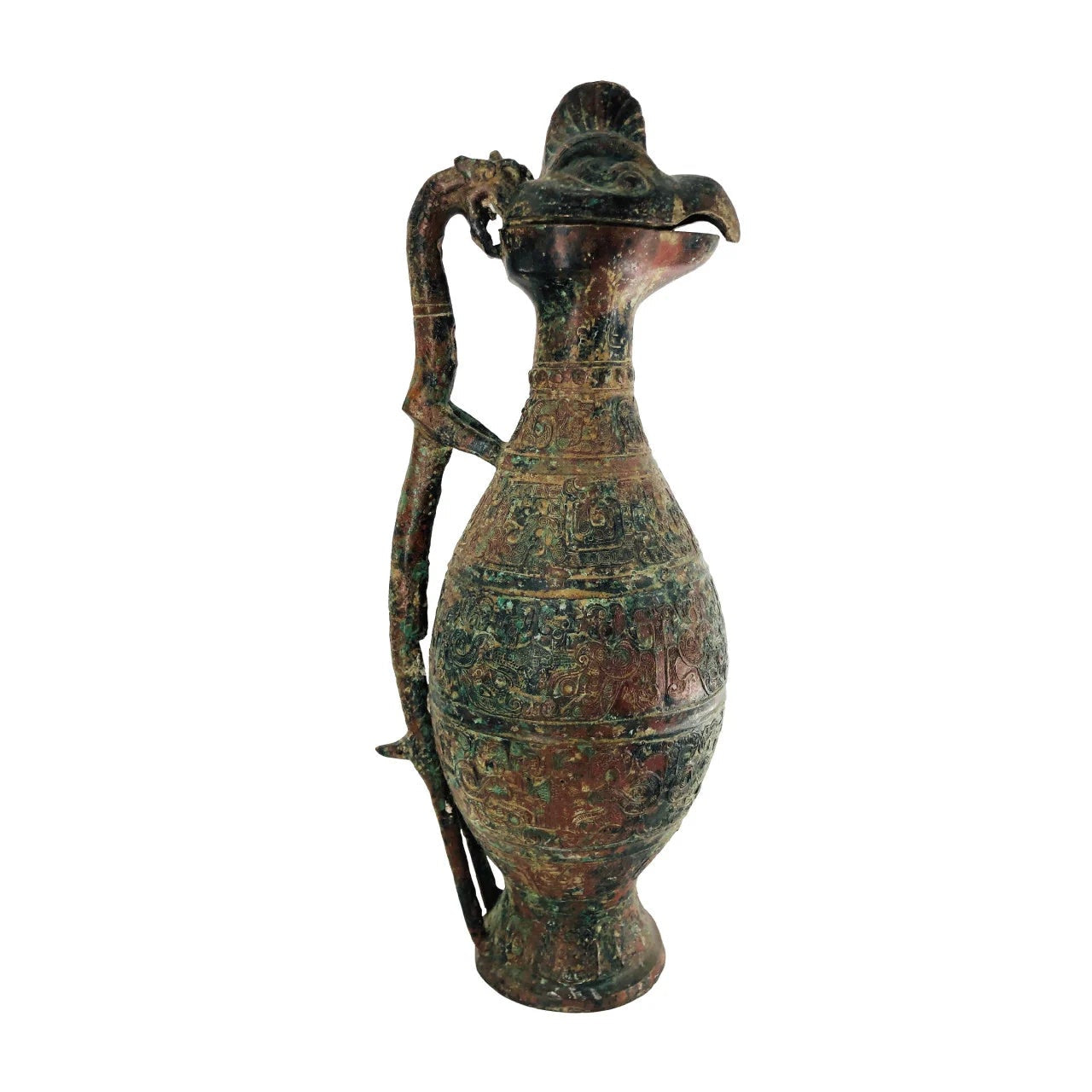 This high-quality antique reproduction is a lost wax cast bronze. Collectors highly seek it due to its authentic details and unique natural patina. These pieces are rare in America and Europe because collectors in Asia often keep them. This particular piece is a ewer, which is used for serving wine at formal banquets.
