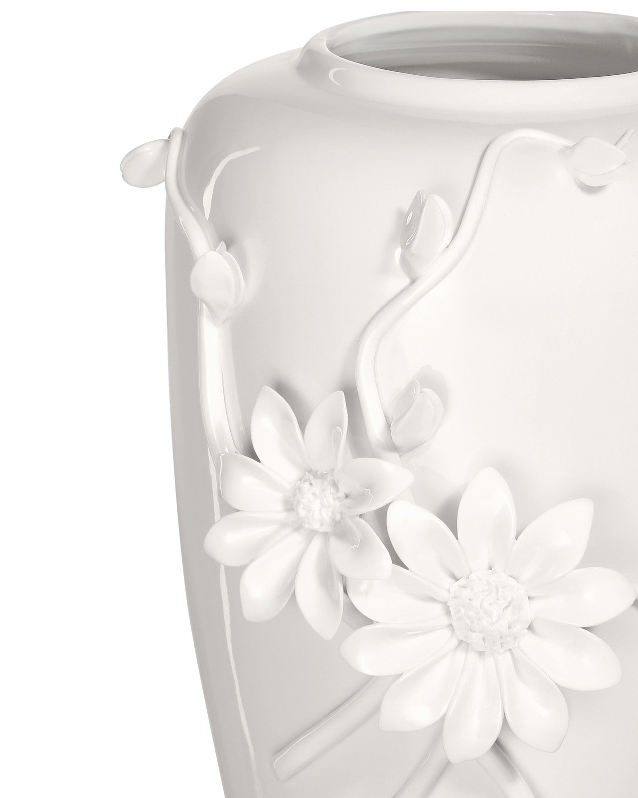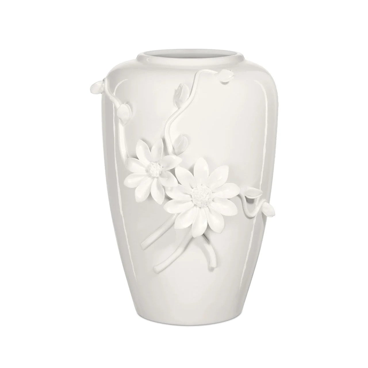 The Daisy Maria Vase is a lovely handcrafted piece. It is made from hand-thrown porcelain and has an urn shape. The vase features individually crafted porcelain flowers that seem to flow across its surface. It stands just over 10 inches tall, making it a perfect accent for fresh flowers or just as a decorative piece on its own.