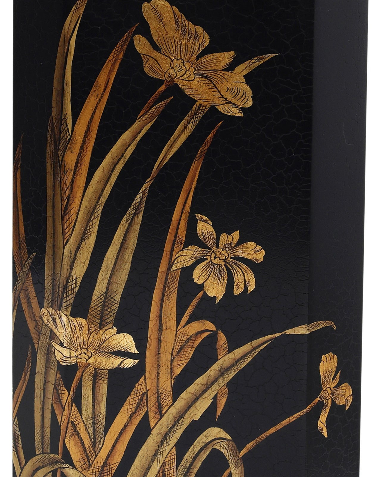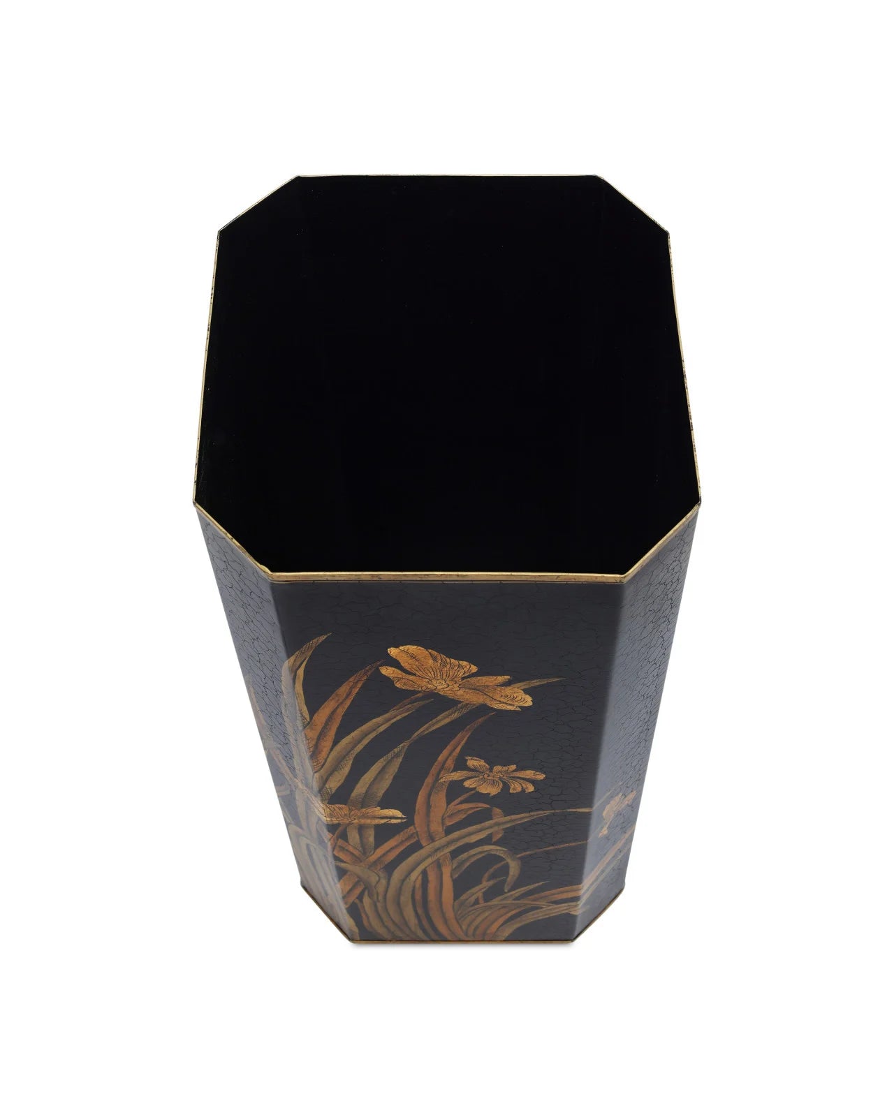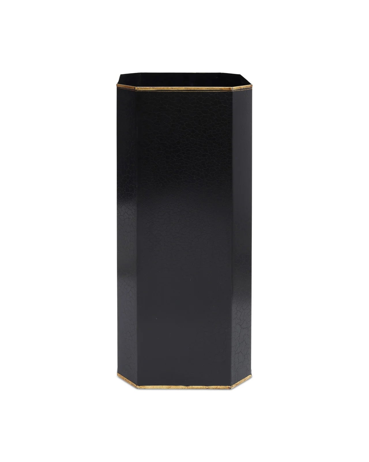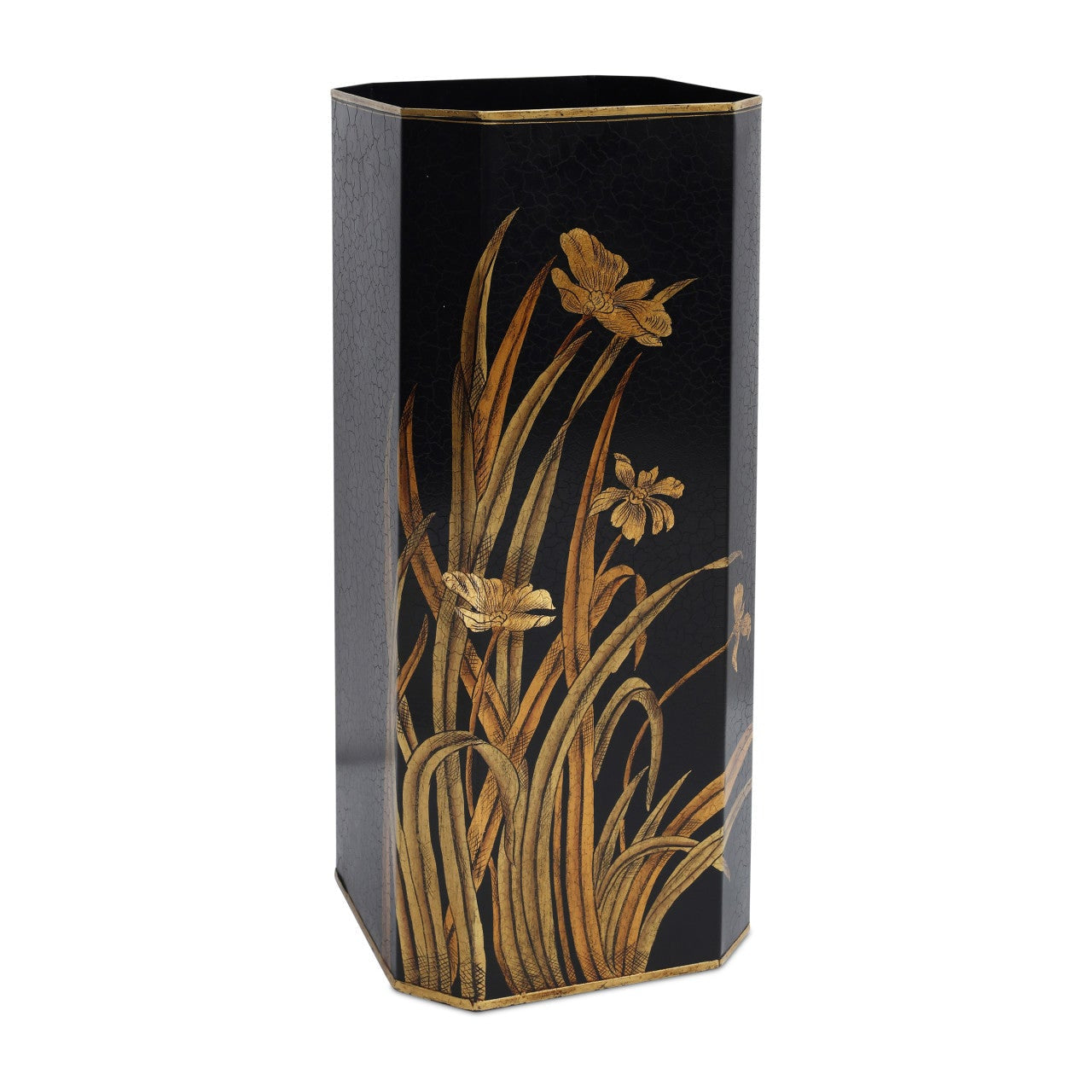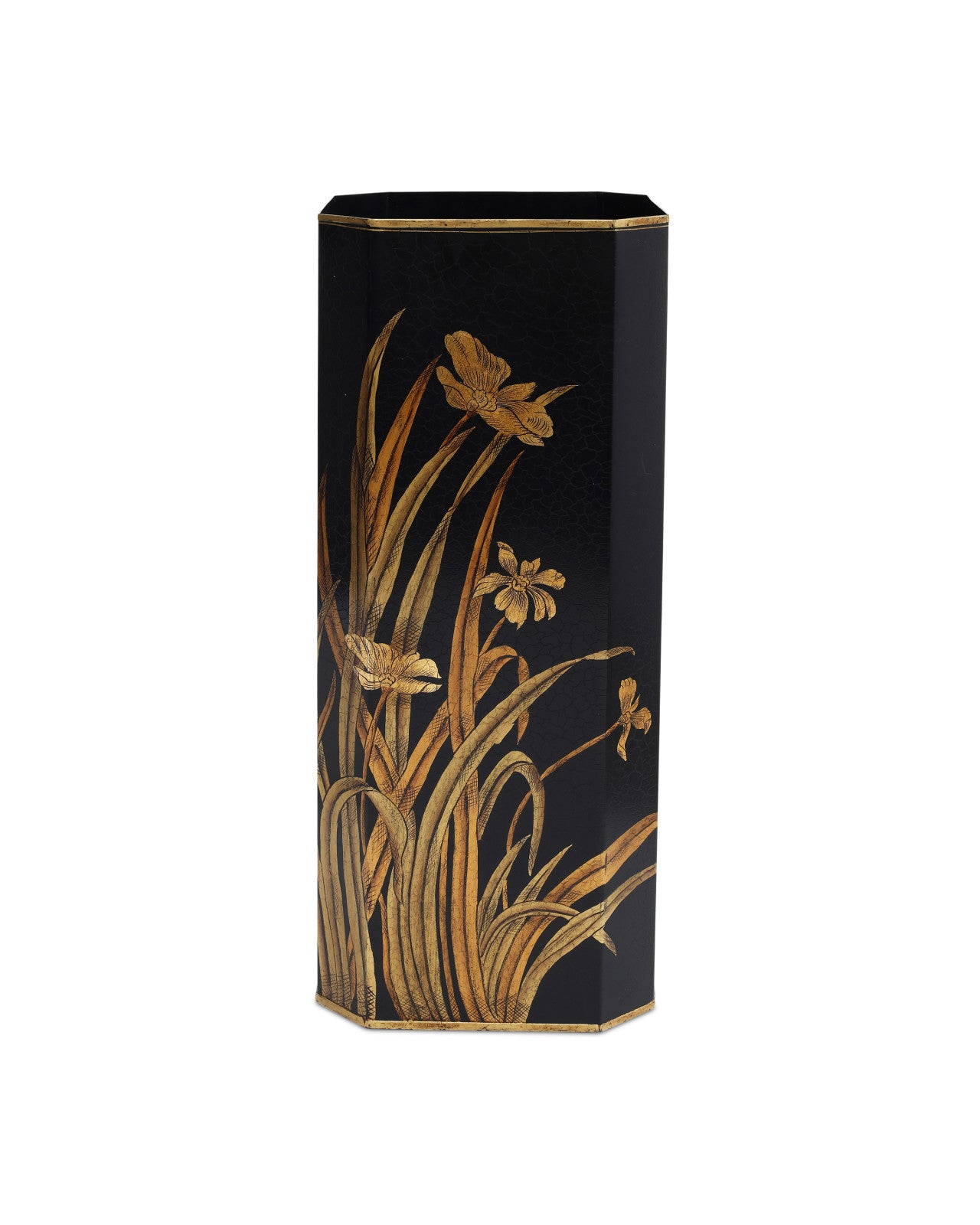The Glasshouse Tole Umbrella Stand features an angular octagonal design made of iron, with a black surface adorned with floral gold embellishments. This elegant piece adds a touch of Americana style while serving a functional purpose. Note that the artisanal finish may result in slight variations in each piece.