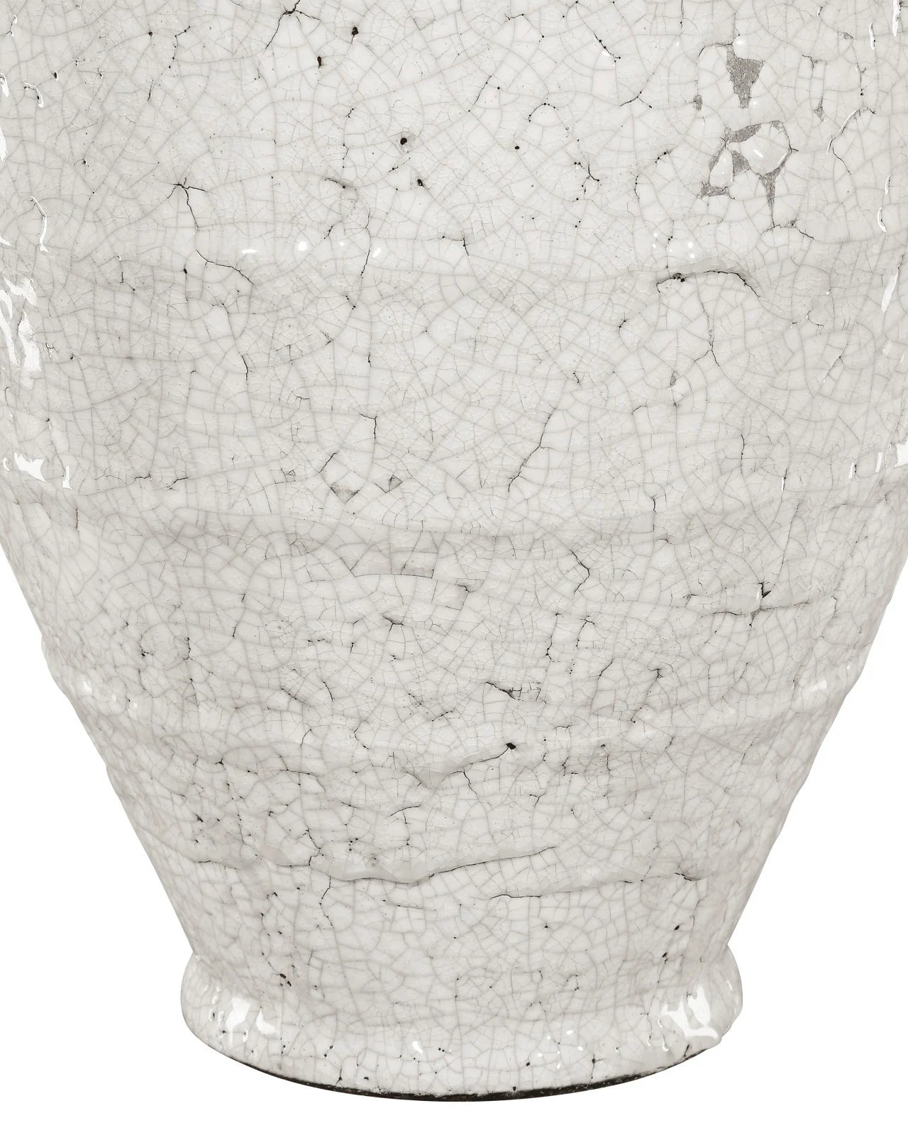 The Glazed Medium Jar, inspired by traditional terracotta jars for preserving olives, features an antique-white, hand-applied glaze with a crackle finish. Each hand-thrown piece has slight variations, making them unique and resembling timeless antiquities in any interior.