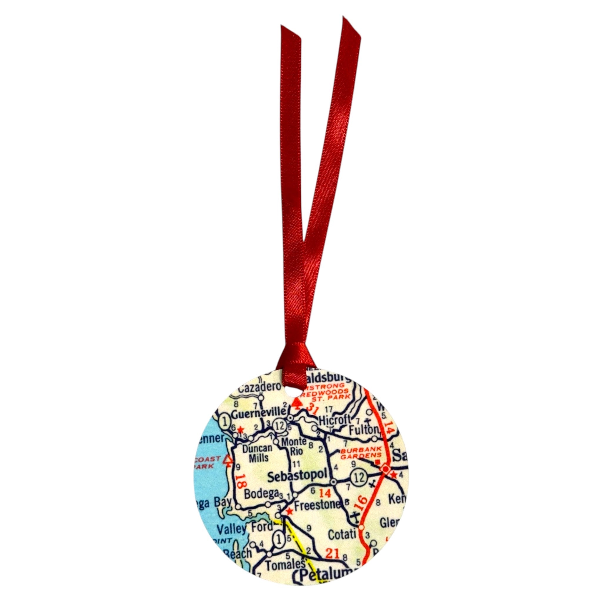Introducing our Sonoma Map Ornament, a beautiful 3-inch round piece made from durable aluminum. Designed and printed in the USA, this ornament features intricate details of the Sebastopol area. It's a perfect addition to your holiday décor or a unique gift for friends and family.