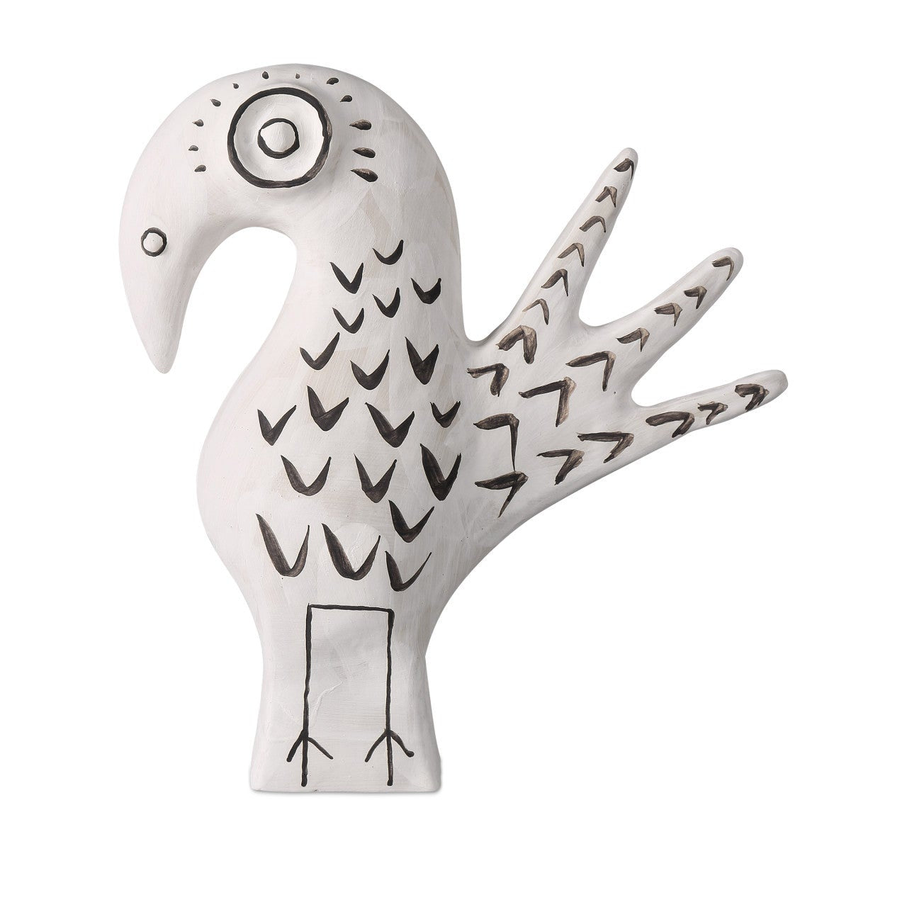 Artist Xiang Yang crafted "Norman the Peacock," a striking porcelain vessel in a washed-white finish with whimsical black details. This unique piece is reminiscent of the stirring impact Picasso's ceramics had during his time in the South of France.