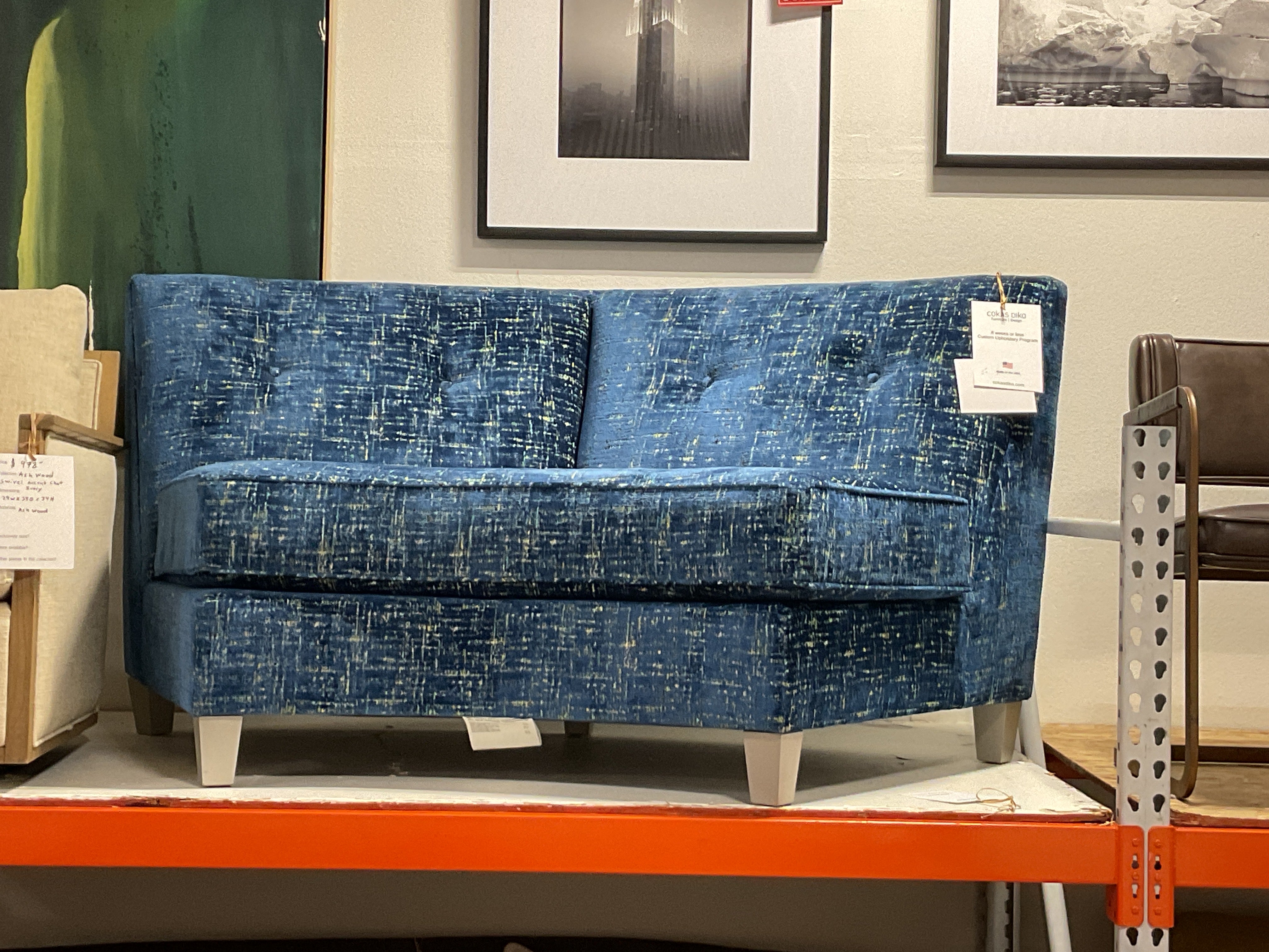 Norwalk Small Curved Settee BLUE POLY Fabric is backordered and will ship as soon as it is back in stock.