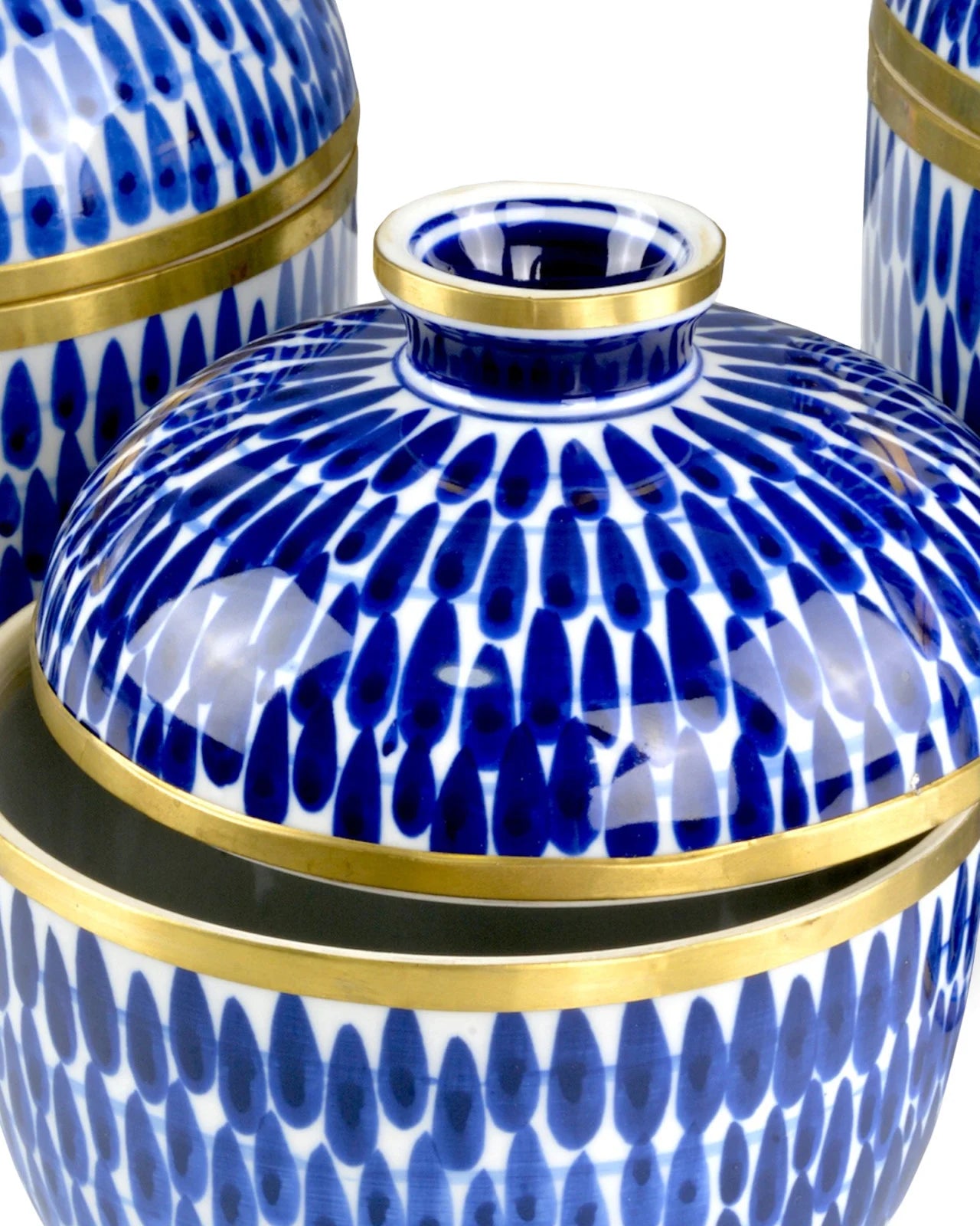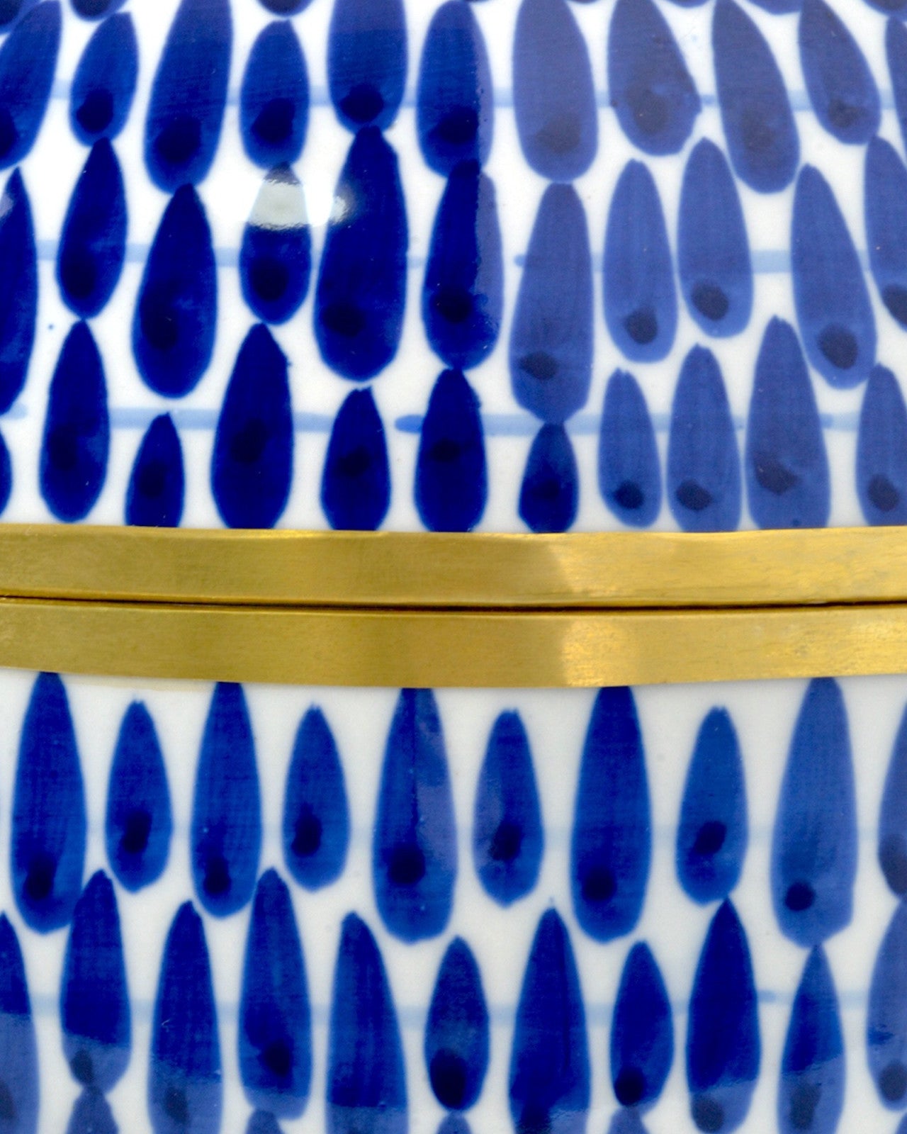Our Plavan Jars feature luminous brass rings along the bottom, top, and lid edges. The electric blue, hand-painted pattern creates a unique artisanal touch, with brushstrokes revealing the artist's technique. Inspired by centuries-old designs, these jars have a modern feel and are sold separately.