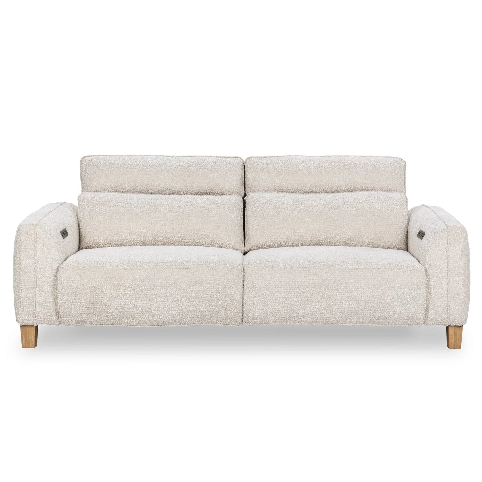 This dual power recliner sofa blends comfort with modern amenities, featuring clean lines and charging ports for electronics. Its neutral boucle upholstery provides a soft touch, while discreet recliner controls suit contemporary spaces.