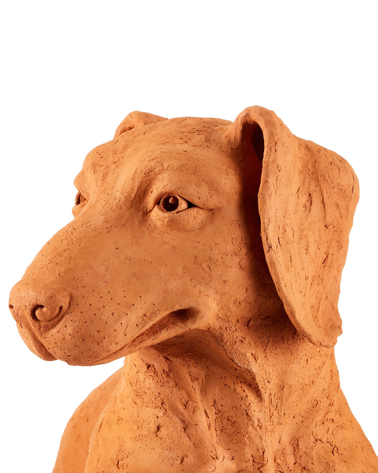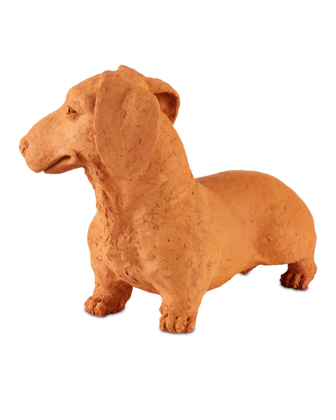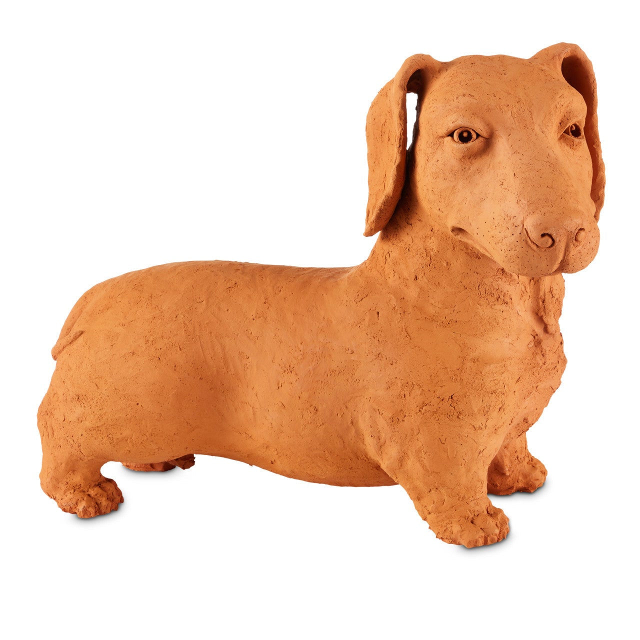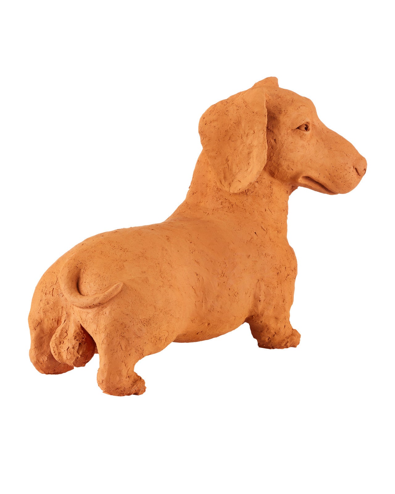 Whimsical in terracotta, Rocky the Teckel is a sculpture by Thai artist Nhut Nhathawut. With a lifelike expression that seems ready to bark, the piece showcases artisanal details, including visible strokes from the artist's tools on the dog's surface.