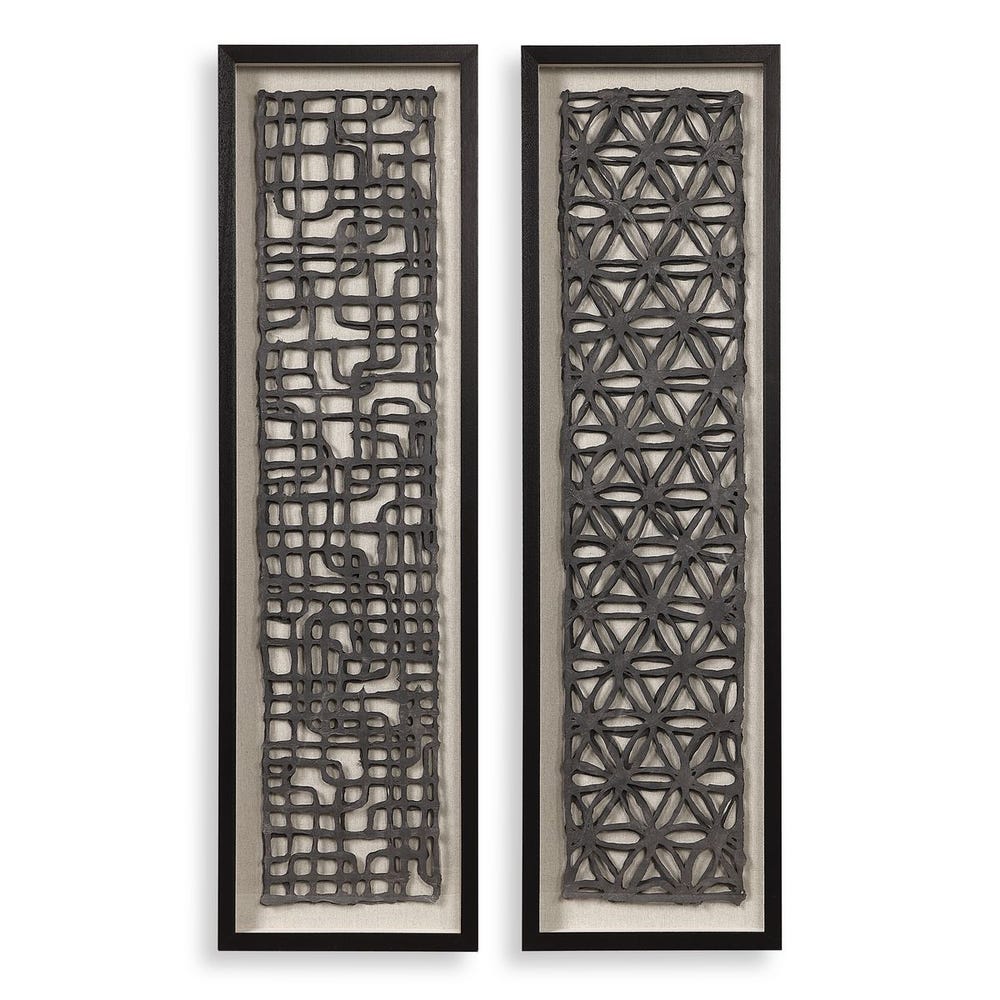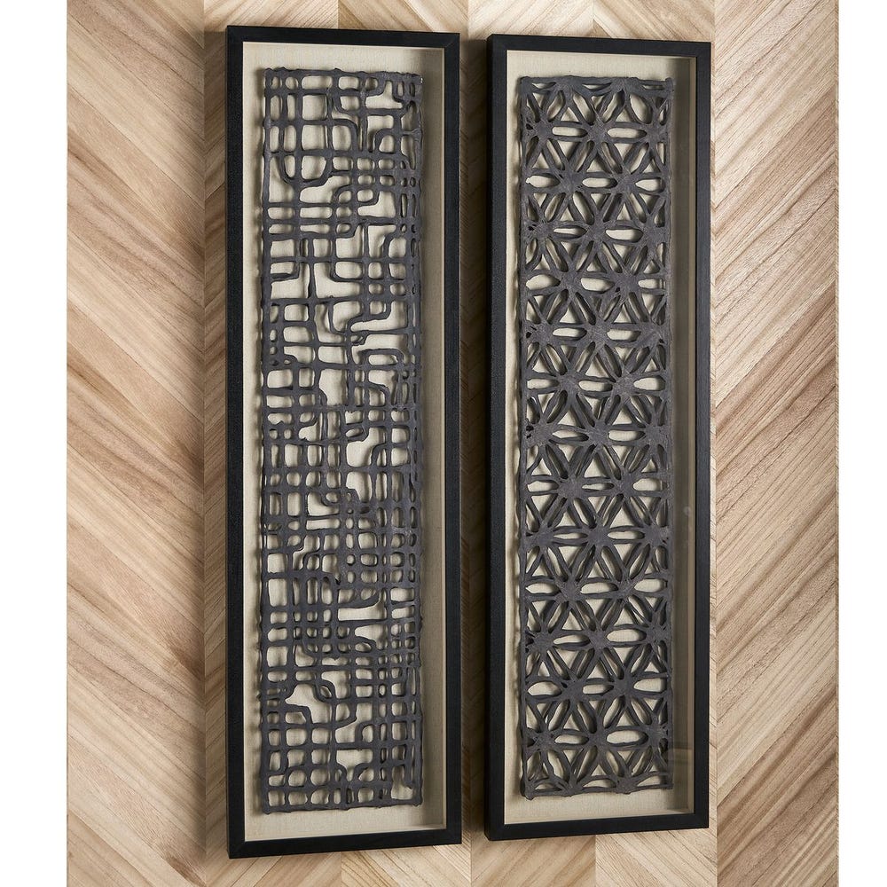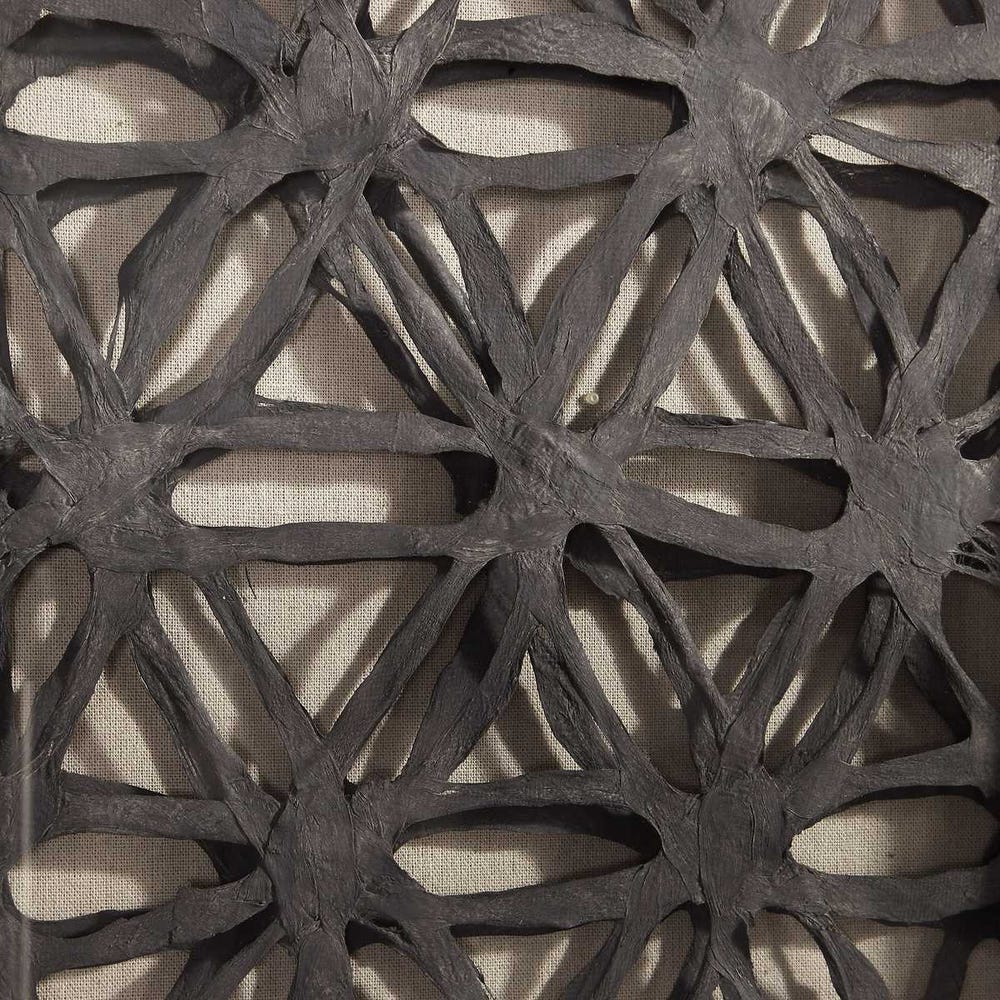 Our Torn Paper Shadow Box features elevated, three-dimensional layers of hand-torn charcoal-black paper, beautifully set against a natural linen fabric background. Each piece is showcased in a shadow box frame made of pine wood, finished in an aged black. The artwork is covered with glass and can be hung either horizontally or vertically. Each piece is sold separately.