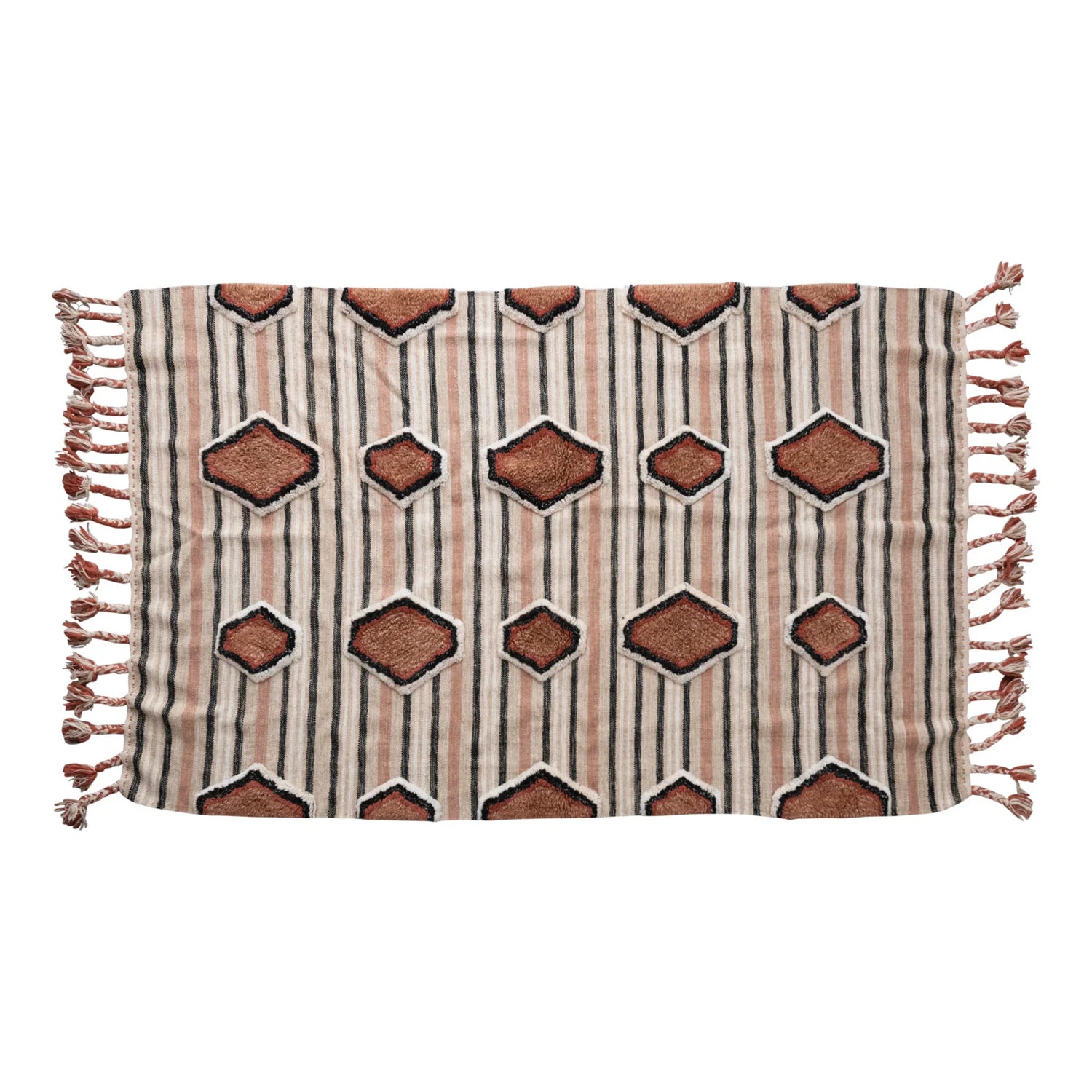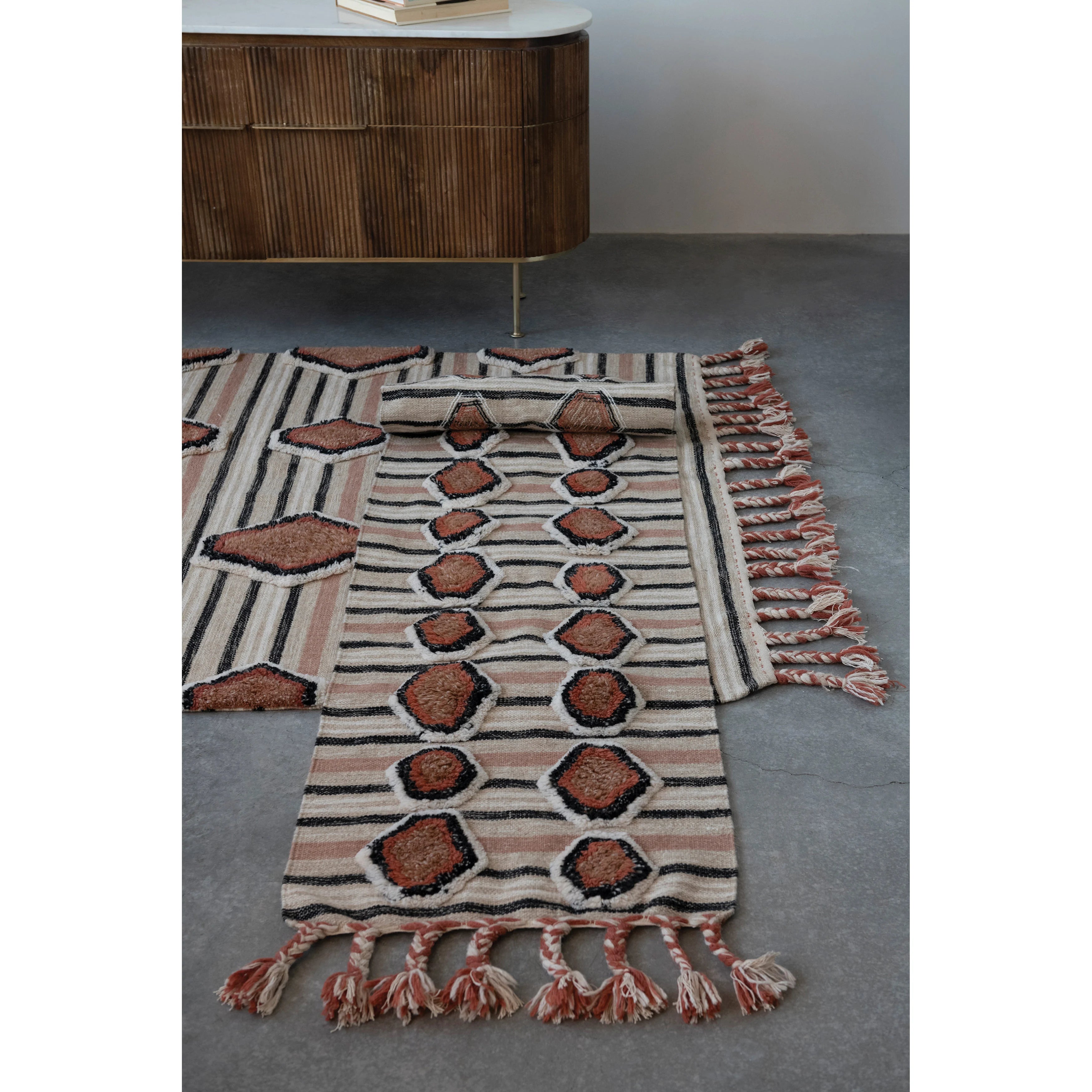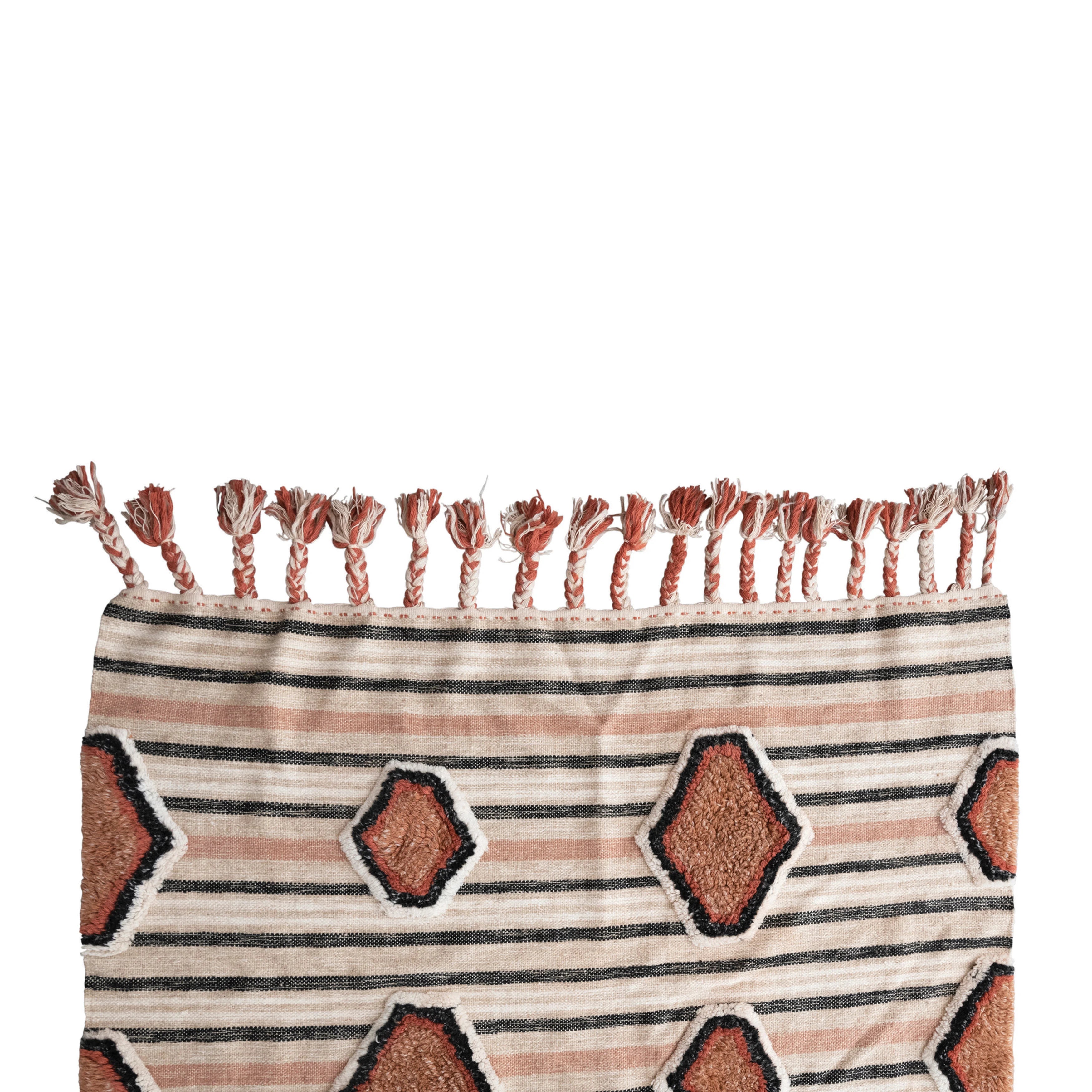 Discover the artisanal charm of this stunning area rug. Crafted from woven kilim cotton, it features delightful tufted embroidery and playful braided tassels. Perfect for adding a touch of color—just spot clean when needed. Made from soft wool and cotton.
