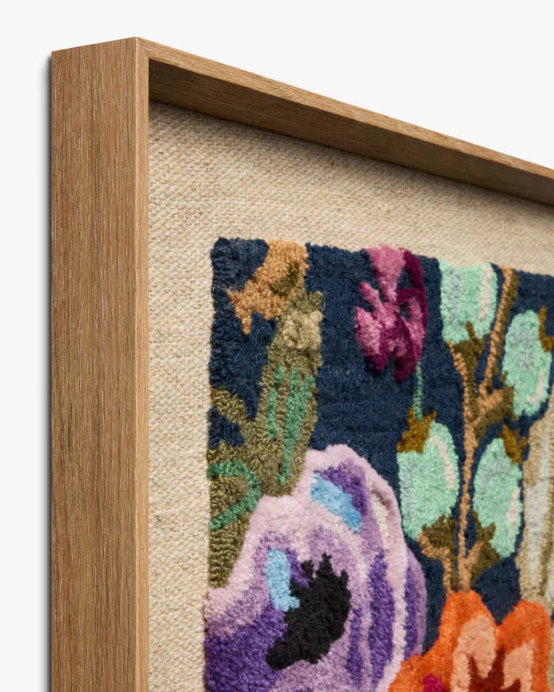 Discover our unique, handcrafted Vintage Blossom Artwork. Embroidered vibrant flowers cascade across this piece with warmth and texture. Each artwork is custom-framed, ensuring a slight variation in dimensions for a truly special touch.