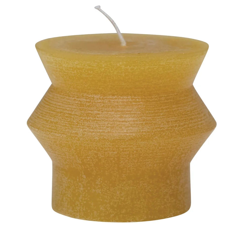 This intricately carved Yellow 3" Candle showcases a striking sculptural design. Add warmth and elegance to any living or dining space with this stunning, unscented candle made from 100% Paraffin Wax.